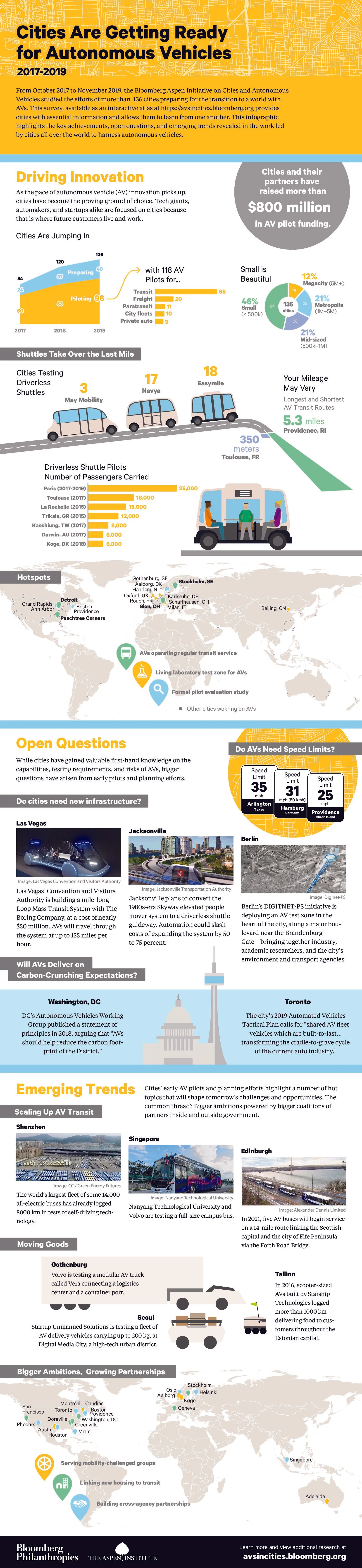 A summary of two years tracking cities’ AV policy and pilot efforts at avsincities.bloomberg.org.